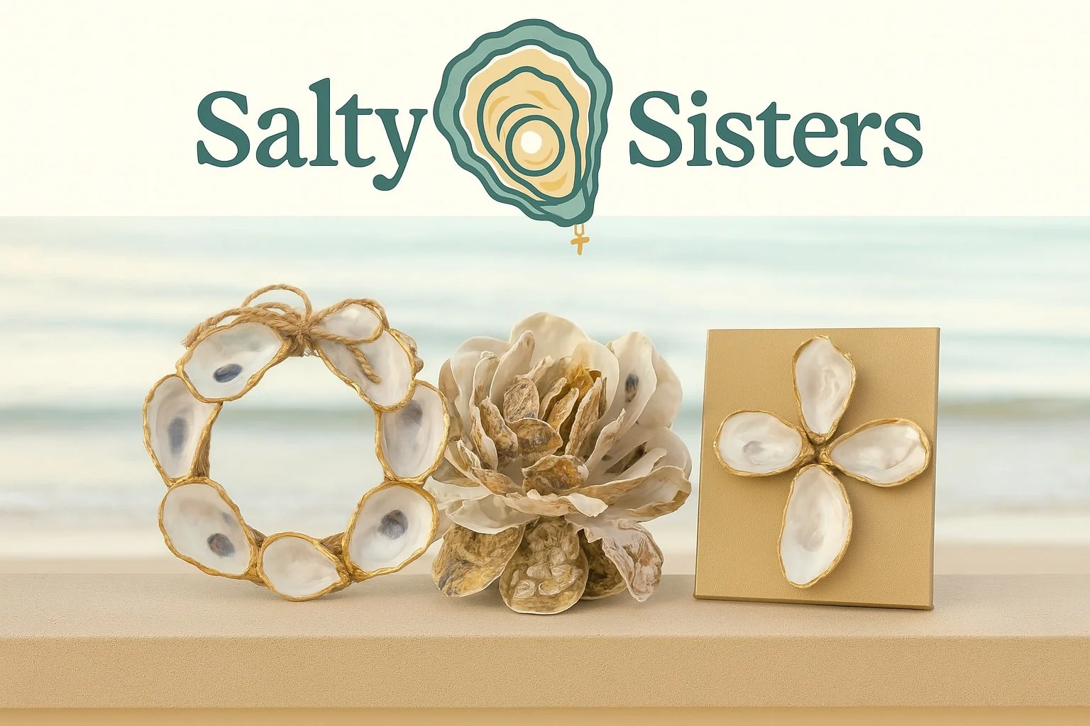 Salty Sisters is a coastal-inspired crafting business run by three lifelong friends with a passion for creativity, community, and peace. We transform local oyster shells and other coastal materials into one-of-a-kind home décor, jewelry, and gifts — each handmade with joy and spiritual intention. Our products are available locally for quick access without shipping delays, and we emphasize sustainability by recycling natural materials.